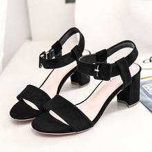 2017新款中跟粗跟凉鞋黑色学生百搭露趾女鞋一字扣带罗马高跟鞋