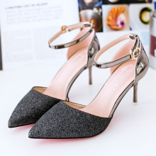 2017春夏高跟鞋细跟尖头银色女鞋浅口时尚中跟单鞋闪粉一字扣凉鞋