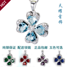 925纯银四叶草水晶镶钻项链 纯银镀白金项链 送女友情人 生日礼物