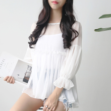 两件套雪纺衫女木耳边七分灯笼袖网纱圆领娃娃衫上衣白色吊带透视