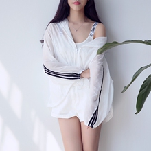 连帽防晒衫外套2017夏季新款女装条纹长袖透气超薄空调衫宽松韩版