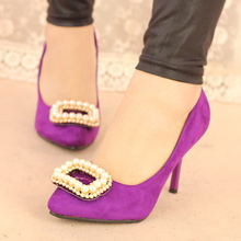 2016新款水钻珍珠方扣婚鞋细跟女鞋尖头浅口红紫黑色高跟单鞋女潮