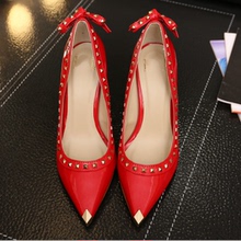 欧美铆钉尖头高跟鞋蝴蝶结细跟单鞋欧美2017春秋浅口漆皮婚鞋女鞋