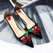 春季2017新款尖头中跟浅口单鞋镂空樱桃鞋细跟高跟鞋真皮凉鞋女