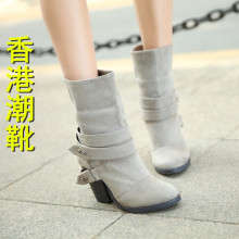 新款粗跟中筒靴圆头马丁靴2016秋冬季平跟中跟高筒女靴复古女鞋潮