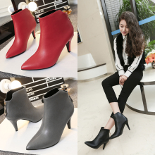 秋冬2016新款尖头高跟短靴细跟裸靴马丁靴中跟灰色真皮女鞋女靴潮