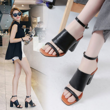 夏季2017新款一字扣带粗跟高跟露趾凉鞋黑色中跟细带真皮凉鞋女潮