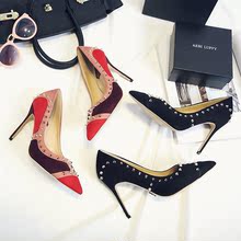 2017春季新款韩版拼色铆钉尖头高跟鞋细跟真皮百搭性感浅口单鞋女