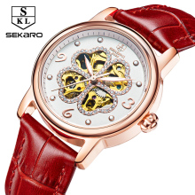 斯卡络红色时尚潮流女表全自动机械表女士正品防水镂空手表真皮带