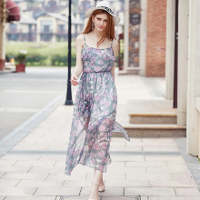 2017夏天旅游海边度假长裙无袖吊带裙开叉荷叶边印花雪纺连衣裙女