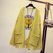 2017春款新款韩版线衣中长款毛衣开衫女宽松破洞针织衫粗毛线外套