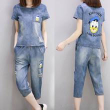 2017新款胖mm夏装牛仔套装大码女装200斤胖妹妹宽松显瘦T恤两件套