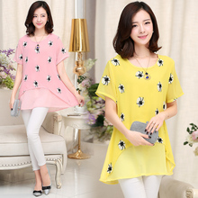 雪纺衫短袖女夏季女装大码宽松显瘦上衣中长款女士打底衫绣花t恤