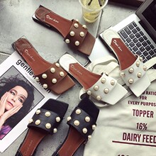 韩版低跟一字型拖鞋女夏2017新款时尚珍珠外穿凉拖一脚蹬懒人拖鞋