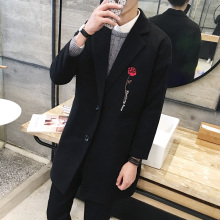 2016新款秋冬季韩版修身中长款风衣男青少年玫瑰绣花简约毛呢大衣