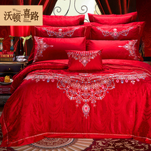 沃顿喜路欧式大红色婚庆床品四件套 刺绣贡缎结婚床上用品六件套