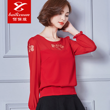 春秋新款女装韩版短款雪纺衫女长袖宽松打底小衫镂空百搭蕾丝上衣