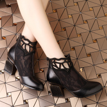 众踱女鞋新款时尚牛皮高跟粗跟尖头网纱单靴短靴裸靴春秋女凉靴