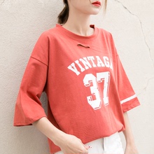 短袖t恤女夏韩版新款学生宽松显瘦bf破洞上衣百搭印花体恤打底衫
