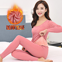 时尚低领紧身保暖内衣女加绒加厚美体秋衣秋裤棉打底衫长袖套装冬