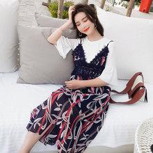 大码女装2017春夏新款胖妹妹mm蕾丝裙拼接吊带裙假两件连衣裙显瘦