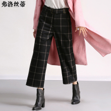 欧美格子裤毛呢阔腿裤女秋冬九分裤羊毛呢裤子女裤直筒宽腿休闲裤