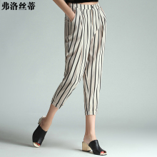 夏季新款竖条纹裤子高腰哈伦裤女裤宽松七分裤休闲裤小脚裤九分裤