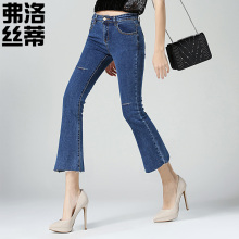 欧美破洞牛仔喇叭裤女裤春秋新款九分裤显瘦毛边牛仔裤大码微喇裤