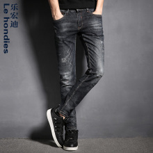 Le hondies黑色怀旧男士牛仔裤时尚破洞个性修身小脚男裤子秋冬款