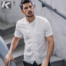[包邮]Kuegou 男士欧美个性圆领短袖衬衫 男白色修身衬衣潮1370