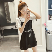 春夏装新品韩版时尚收腰蕾丝拼接镂空假两件套显瘦中长款连衣裙女