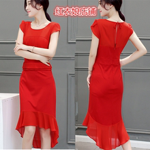夏红色新娘回门装结婚敬酒晚宴会小礼服中长款修身短袖雪纺连衣裙