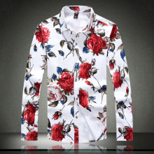 男士长袖衬衫春新款男装上衣中国风绸缎大码纯棉春装印花衬衣潮