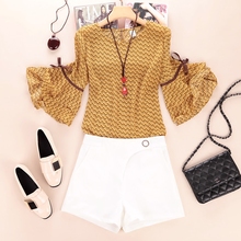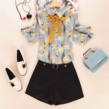 2017夏季新款女装韩版宽松V领喇叭袖印花两件套雪纺衫上衣潮-8186