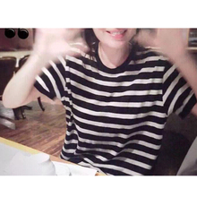 樱夫人短袖女2017夏季新款打底衫上衣圆领宽松黑白条纹t恤女短袖