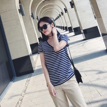 樱夫人t恤女夏2017新款纯棉宽松V领海军风蓝白条纹t恤女短袖上衣