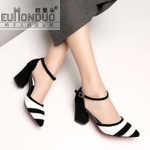 2017春夏新款韩版真皮包头高跟凉鞋女羊皮一字扣中跟尖头粗跟单鞋