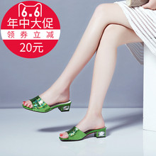 真皮拖女夏时尚外穿凉拖鞋室外2017新款高跟爆款粗跟一字拖外出潮