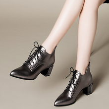 2017春季新款粗跟单鞋女真皮尖头高跟鞋英伦风女鞋系带深口小皮鞋