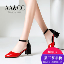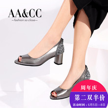 AA&CC2017春秋新款单鞋真皮鱼嘴鞋 牛皮粗跟鞋女亮片高跟鞋女鞋子