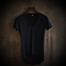 2017夏季新款深V领男士短袖T恤 纯色前短后长大码不规则修身t恤男