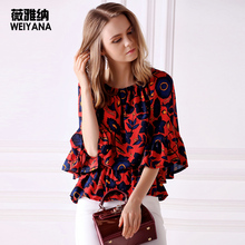 薇雅纳2016 时尚优雅松紧领印花娃娃雪纺衫上衣女