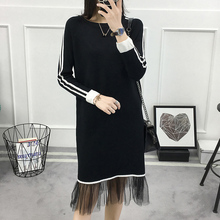 2017春季圆领长袖拼色下摆拼接网纱针织打底毛衣连衣裙新款女装