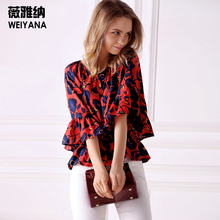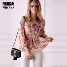 薇雅纳2016年夏季 领部系带印花娃娃装雪纺衫九分袖上衣