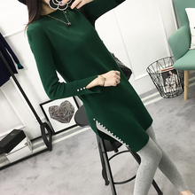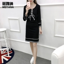 开叉下摆钉珠装饰中长款针织打底毛衣连衣裙2017春秋新款时尚潮流