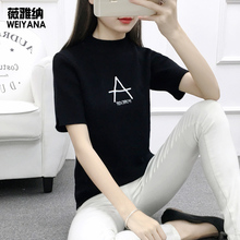 薇雅纳2016秋新品 时尚百搭半高领短袖A字母绣花毛衣