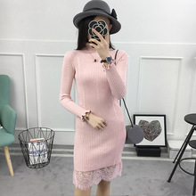 麻花荷叶边高领长袖修身显瘦蕾丝边中长款针织厚款毛衣连衣裙女
