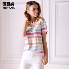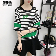 薇雅纳2016秋新款 字母绣花条纹撞色 圆领针织上衣