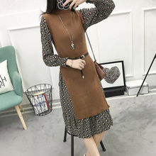 2016冬季新款松紧领雪纺碎花连衣裙针织开叉马甲两件套5241-FRJO