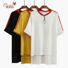 2017夏装新款宽松中长款韩版时尚撞色百搭圆环短袖不规则棉t恤女
